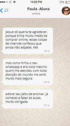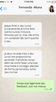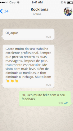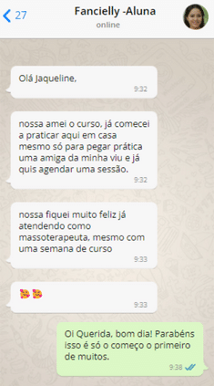 Sempre gostei de fazer massagem, então resolvi procurar um curso online para me especializar. Foi quando encontrei “O Segredo da Massoterapia” ministrado pela Jaqueline. Adicionei então seu WhatsApp e foi aí que percebi que estava no caminho certo. Jaqueline me deu e me dá todo suporte pelo WhatsApp, enfim ela é super atenciosa e o curso é perfeito! Super prático de fazer, interessante e moderno.